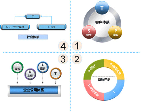 教师培训分为四大体系,分别是客户体系,园所体系,企业公司体系以及社会体系。